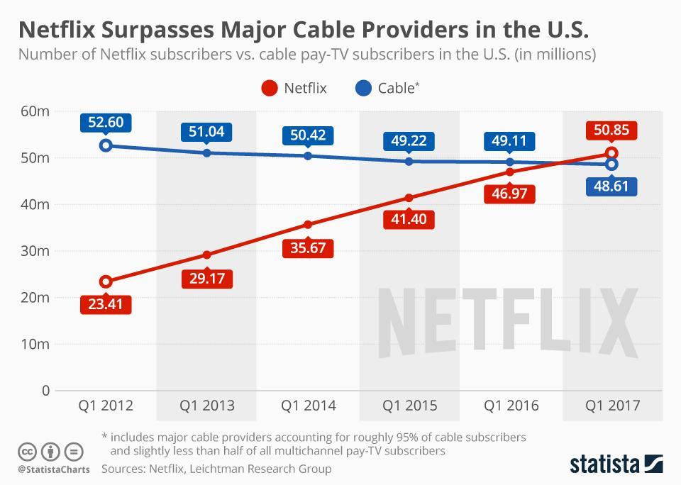 2017 की पहली तिमाही में, नेटफ्लिक्स ने एक बड़ा मील का पत्थर पार किया। देश में सबसे बड़े केबल प्रदाताओं के दर्शकों की तुलना में अधिक अमेरिकियों ने लोकप्रिय स्ट्रीमिंग सेवा की सदस्यता ली थी। इस माइलस्टोन को पार करना लंबे समय से अपेक्षित था, लेकिन यह तब भी एक उल्लेखनीय उपलब्धि थी।