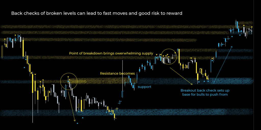 Sebagai aturan, ketika melakukan perdagangan dengan indikator teknis, dianggap bahwa setiap kali ada breakout di zona support maka zona itu langsung menjadi zona resistance. Demikian juga, ketika ada breakout di zona resistance, zona itu langsung menjadi zona support. Jadi secara keseluruhan, pengujian ulang harga atau pemeriksaan kembali berguna saat mengikuti tren dalam perdagangan Anda.